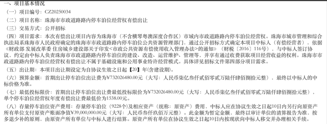 “出让珠海市(不含横琴粤澳深度合作区)市域内市政道路路内停车泊位经营权,出让期为20年,首期出让停车泊位共23798个(包括存量停车泊位和新增停车泊位)、未来新增停车泊位,停车泊位出让费为732026480.00元,单个停车泊位经营权年度有偿出让费最低价为1538.00元,最终以中标人的中标价格为准。”近日,广东省公共资源交易平台发布了一则关于《珠海市市政道路路内停车泊位经营权有偿出让》的招标信息,其中不少内容引发市民关注。