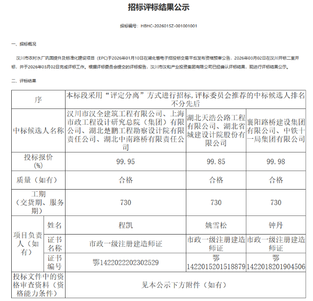 3月2日,湖北省汉川市农村水厂巩固提升及标准化建设项目(EPC)中标候选人公示。